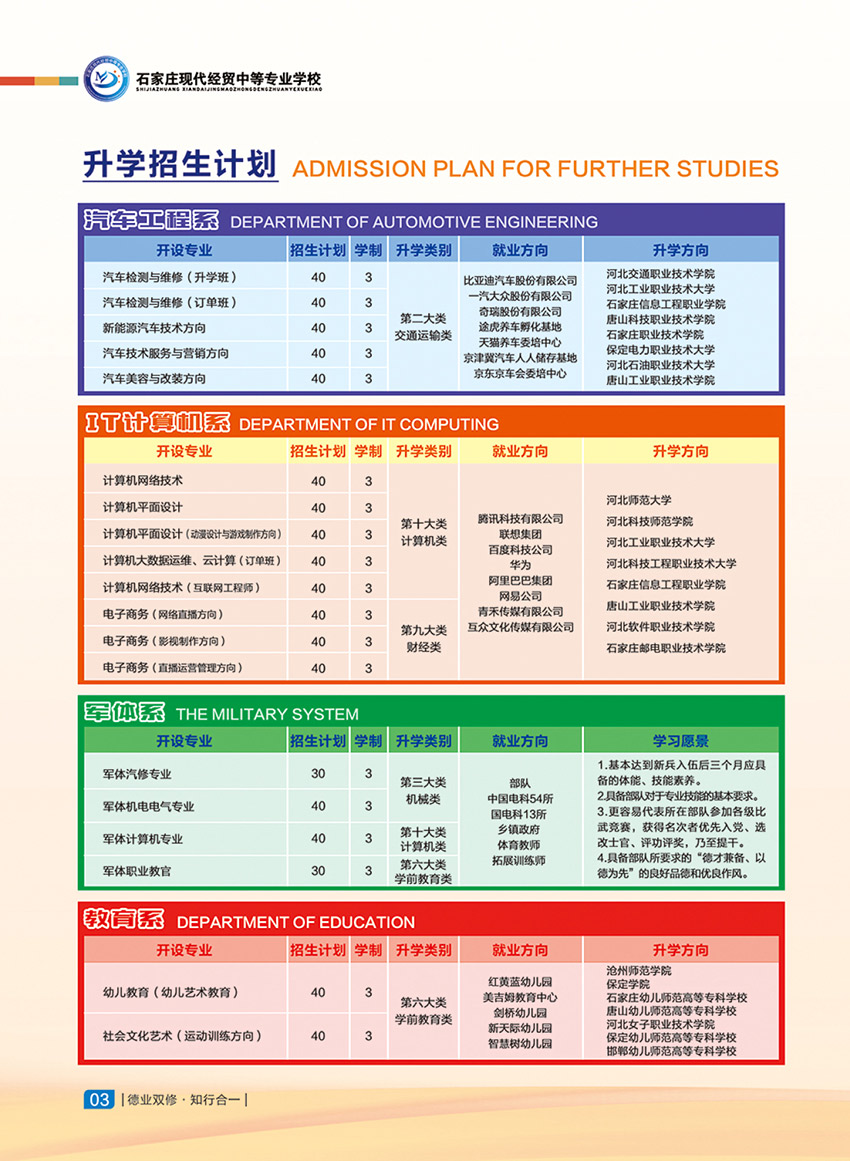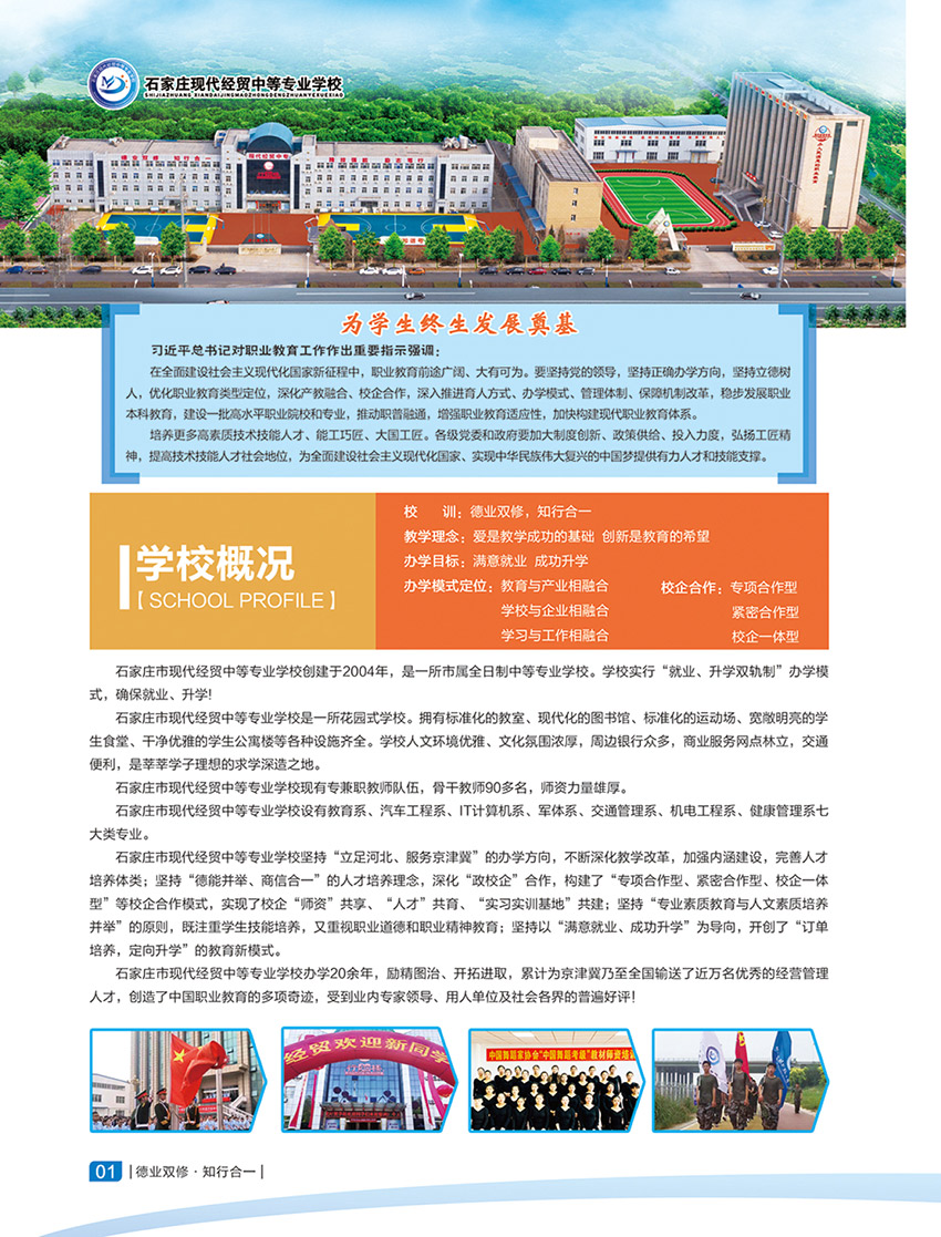 石家庄现代经贸中等专业学校创建于2004年,距今已有20年办学历史,是一所市属全日制中等专业学校,学校实行“就业、升学双轨制”办学模式,确保学生能够顺利升学,稳定就业。学校设置有汽车工程系、IT计算机系、军体系、教育系、交通管理系、机电工程系、健康管理系、升学部等七类专业和升学班。均采用小班授课精确指导,保证学生学习质量。